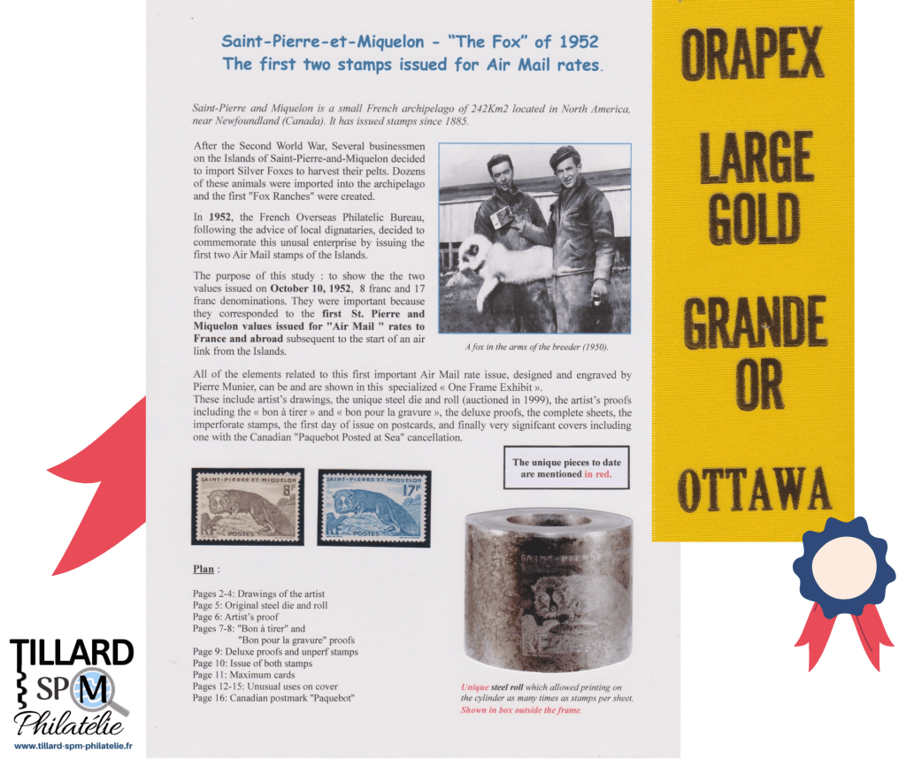 Cette année, j’ai choisi de concourir uniquement dans cette seconde catégorie avec mon étude ‘semi moderne’ sur les deux timbres « renard argenté » émis en 1952. Cette collection de 16 pages (ce qu’on appelle le 1 cadre) est ma seule étude traduite dans la langue anglaise.