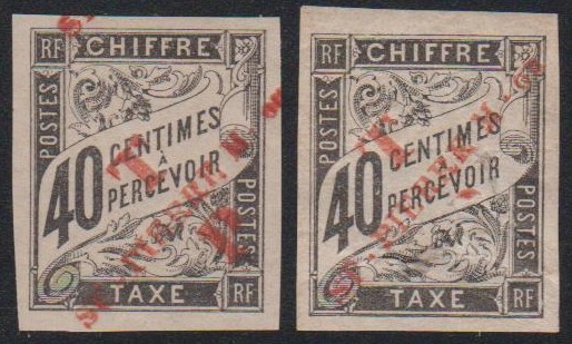 Ces timbres-taxe des colonies ont été surchargés à St-Pierre-et-Miquelon en 1892 puis transformés en timbres-poste grâce à la mention « T P ». Peu de variantes sur ces émissions.