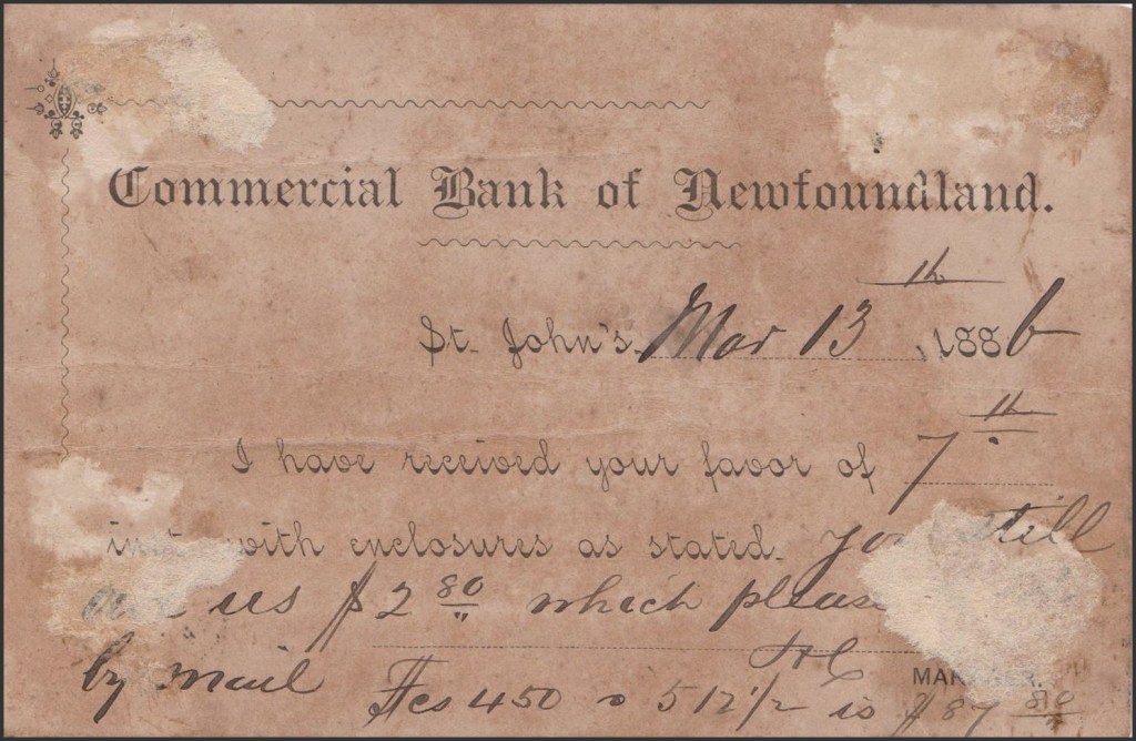 Parmi tous les entiers postaux connus adressés vers SPM depuis l’étranger au 19ème siècle, l’un est envoyé de Terre-Neuve (colonie britannique à cette époque) le 13 Mars 1886 et a transité par St-John’s deux jours plus tard. La vignette est annulée par une oblitération manuelle et muette.